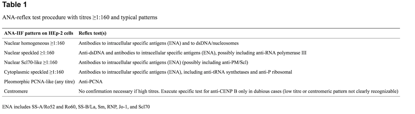 57. Deng X, Peters B, Ettore MW, et al. Utility of Antinuclear Antibody Screening by Various Methods in a Clinical Laboratory Patient Cohort. J Appl Lab Med. Jul 1 2016;1(1):36-46. doi:10.1373/jalm.2016.020172