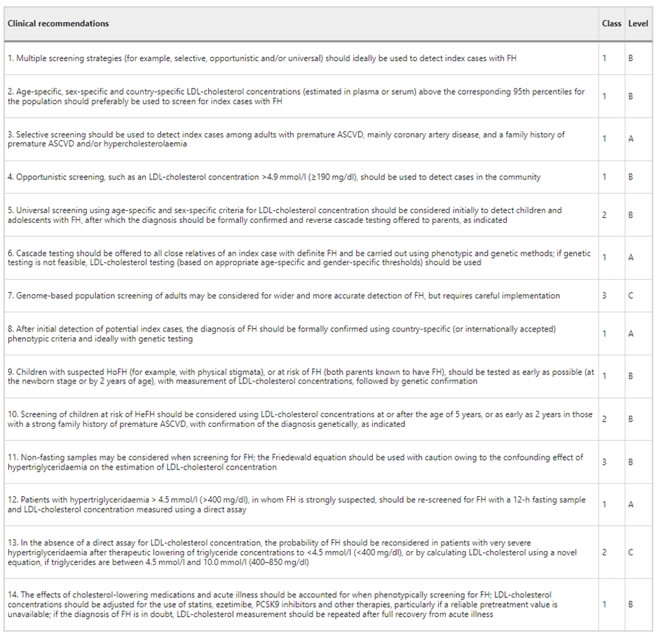 • “We recommend that genetic testing be offered, when available, to complement a diagnosis of FH and enable cascade screening (Strong Recommendation, High Quality Evidence). The decision to request genetic screening should be made by the treating physician after discussion with the patient.”