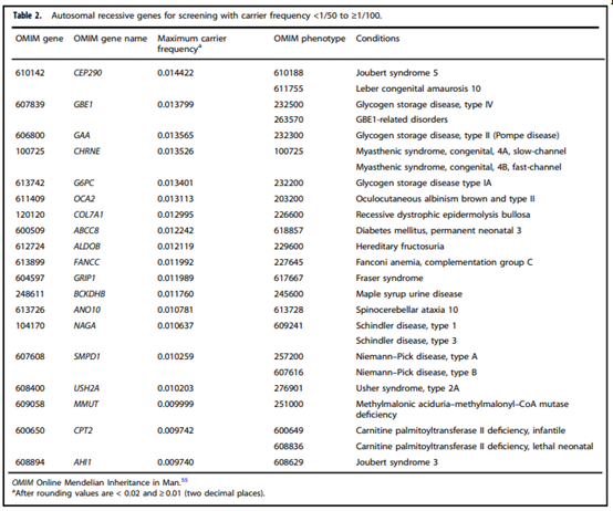 - “All pregnant patients and those planning a pregnancy should be offered Tier 3 carrier screening for autosomal recessive (Tables 1–5) and X-linked (Table 6) conditions.”