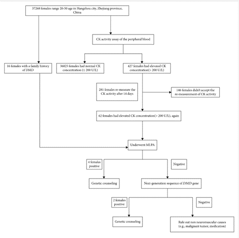 17. Han S, Xu H, Zheng J, et al. Population-Wide Duchenne Muscular Dystrophy Carrier Detection by CK and Molecular Testing. BioMed Research International. 2020/09/27 2020;2020:8396429. doi:10.1155/2020/8396429