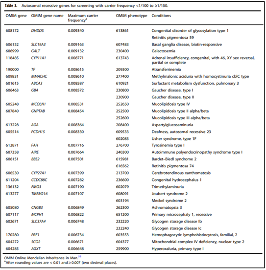- “All pregnant patients and those planning a pregnancy should be offered Tier 3 carrier screening for autosomal recessive (Tables 1 – 5) and X-linked (Table 6) conditions.”